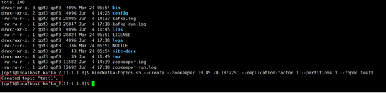 (5)、另起一个终端,仍在相同目录下运行“创建 kafka 消费者”的命令。消费者会收到生产者发来的消息。如图,我接收到了之前发的”qpf_test”的消息。