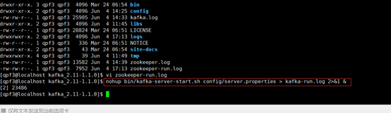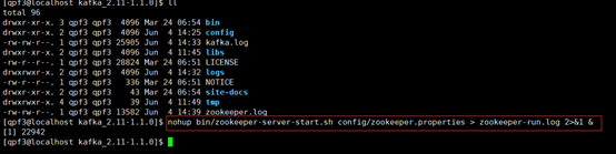 (1)、进入”kafka_2.11-1.1.0”文件夹,运行”开启 kafka 自带 zookeeper”命令 (最好用后台模式)。记得进入日志中,检查下启动是否有错误。