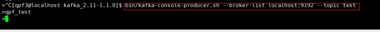 (4)、继续在此目录下,运行“创建 kafka 生产者”的命令。kafka 默认端口是 9092。(图片里我自己改成了 9192,没改的直接用 9092 端口)。如图,我发送了”qpf_test”的消息。