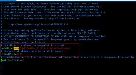 (3)、配置“zookeeper.properties”。修改 dataDir 和 clientPort。前者是快照存放地址 (自己随意配置),后者是客户端连接 zookeeper 服务的端口。