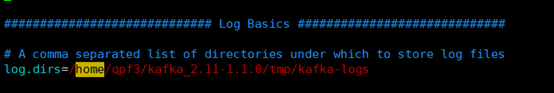 (4)、配置 kafka_2.11-1.1.0/config 下的“server.properties”,修改 log.dirs 和 zookeeper.connect。前者是日志存放文件夹,后者是 zookeeper 连接地址(端口和 clientPort 保持一致)。
