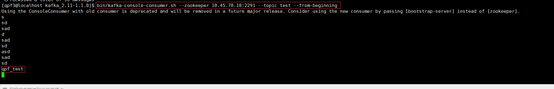 开启 kafka 自带 zookeeper: 前台运行: bin/zookeeper-server-start.sh config/zookeeper.properties 后台运行: nohup bin/zookeeper-server-start.sh config/zookeeper.properties > zookeeper-run.log 2>&1 & (关于后台启动命令,可看我的另一篇博客:《Linux 后台运行进程》) 开启 kafka: 前台运行: bin/kafka-server-start.sh config/server.properties 后台运行: nohup bin/kafka-server-start.sh config/server.properties > kafka-run.log 2>&1 & 创建 kafka 主题: bin/kafka-topics.sh –create –zookeeper 10.45.xx.xx:2191 –replication-factor 1 –partitions 1 –topic test 显示 kafka 所有主题: bin/kafka-topics.sh -list -zookeeper 10.45.xx.xx:2191 创建 kafka 生产者: bin/kafka-console-producer.sh –broker-list localhost:9092 –topic test 创建 kafka 消费者: bin/kafka-console-consumer.sh –zookeeper 10.45.xx.xx:2191 –topic test –from-beginning 解释: –zookeeper:后面接的是你配置的 zookeeper 地址 –broker-list: 默认端口为 9092. 可自行更改 |