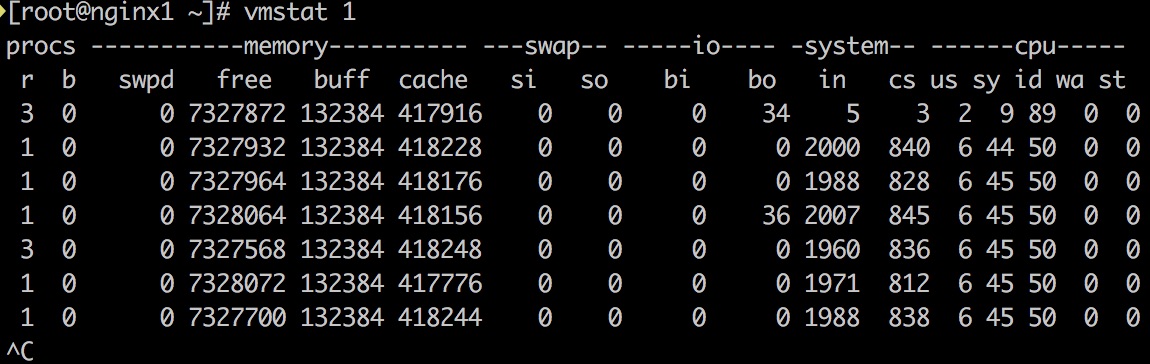 - vmstat 是 virtual memory stat 的简写,能够打印 processes, memory, paging, block IO, traps, disks and cpu 的相关信息。