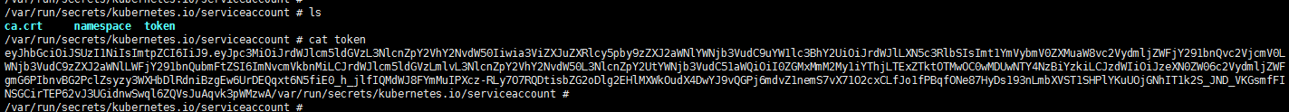 每个 pod 中都包含 /var/run/secrets/kubernetes.io/serviceaccount/token 文件,如下图所示,文件内容用于对身份进行验证,token 文件持有 serviceaccount 的认证 token。