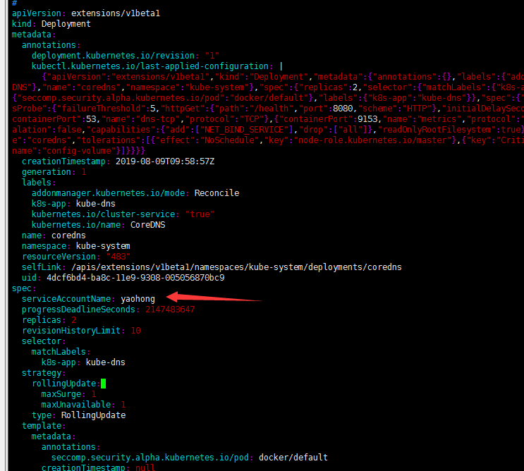 在 pod 中定义的 spec.serviceAccountName 字段上设置,此字段必须在 pod 创建时设置后续不能被修改。