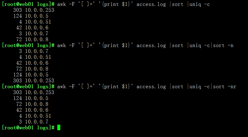 awk ‘{print $1}’ access.log|sort | uniq -c |sort -n -k 1 -r|more