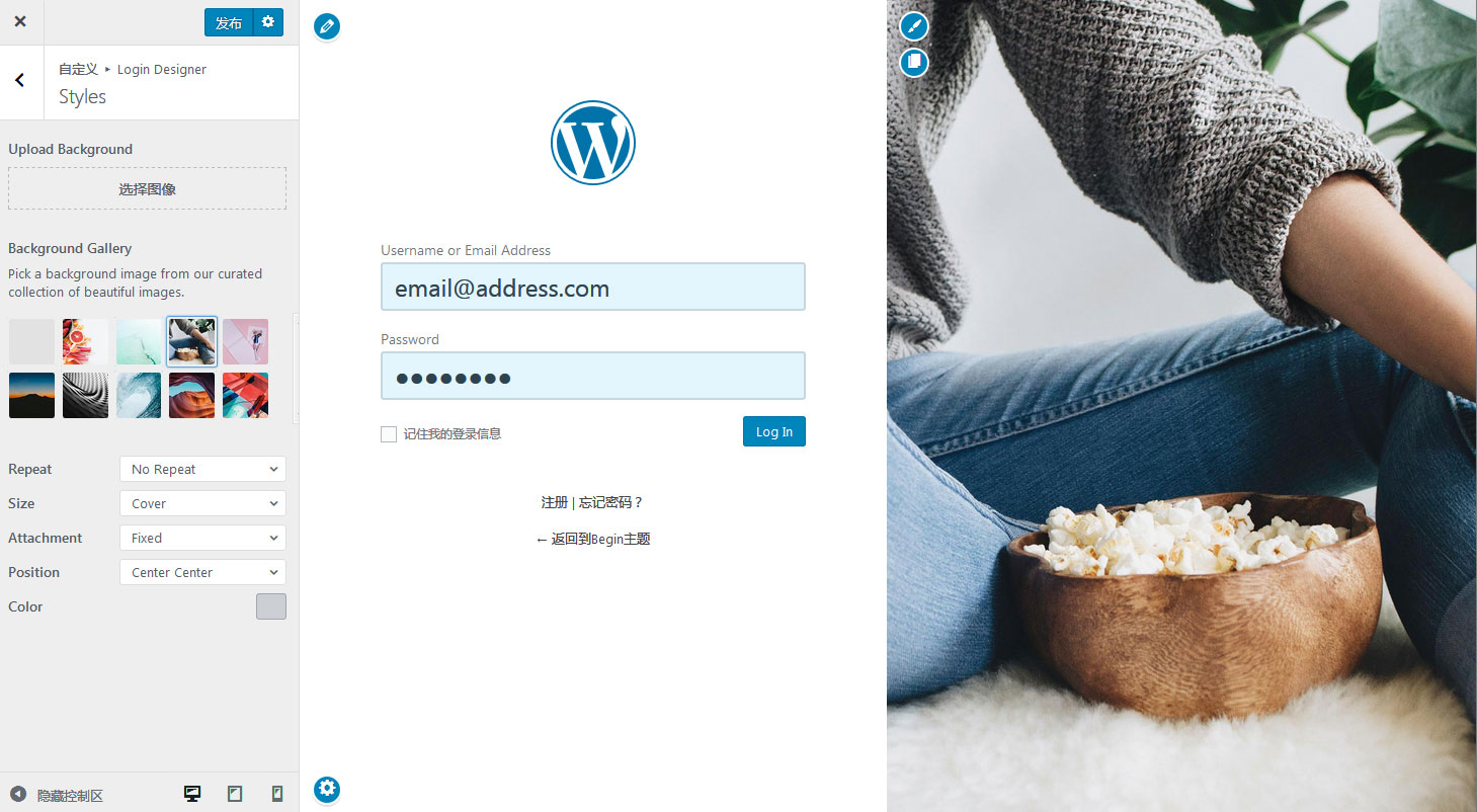 安装启用插件后,WP 后台 → 外观 → Login Designer,在 WordPress Customizer 编辑器模式,进行选择风格和替换背景图片等操作。