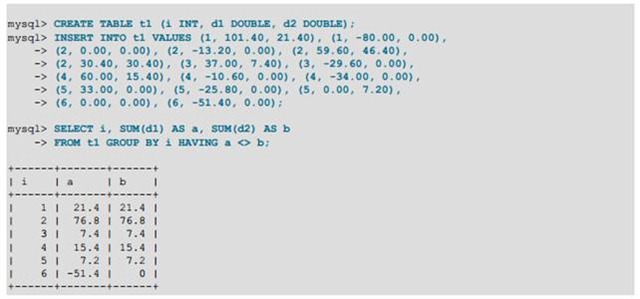 Floating-point numbers sometimes cause confusion because they are approximate and not stored as exact values. A floating-point value as written in an SQL statement may not be the same as the value represented internally. Attempts to treat floating-point values as exact in comparisons may lead to problems. They are also subject to platform or implementation dependencies. The FLOAT and DOUBLE data types are subject to these issues. For DECIMALcolumns, MySQL performs operations with a precision of 65 decimal digits, which should solve most common inaccuracy problems.