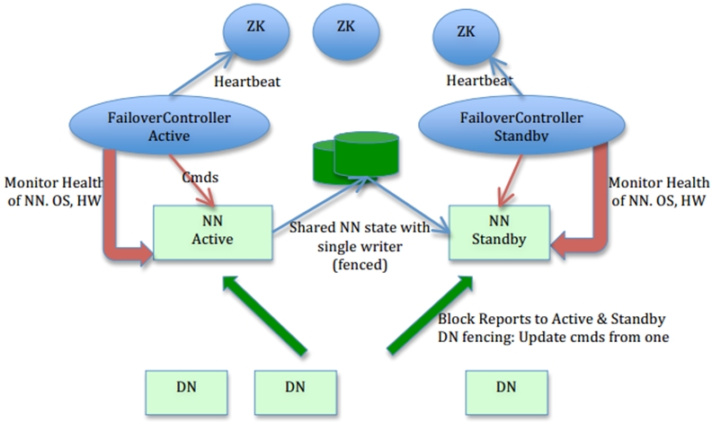 3)用户端(client)必须被合适配置并采用一种对用户透明的方式处理 namenode 的失败恢复。综合起来,如下图所示: