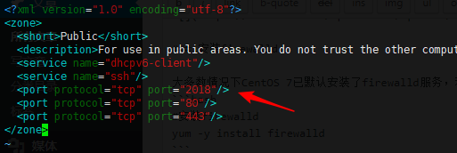 比如您将 SSH 端口修改为了 2018,可尝试直接编辑 firewalld 的配置文件vi /etc/firewalld/zones/public.xml,里面加入一条规则: