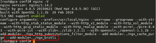 如果编译不出错的情况下,输入 nginx -V 就可以看到 ngx_brotli 模块了,如下截图。