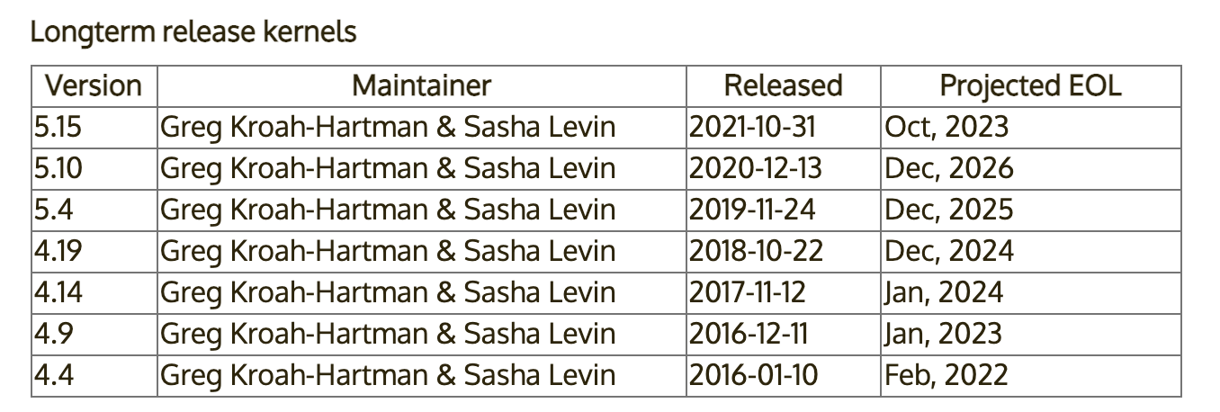 再通过 https://www.kernel.org 官网对照下上面两个版本的生命周期,可以看到 5.15 支持到 2023 年,而 5.4 支持到 2025 年。