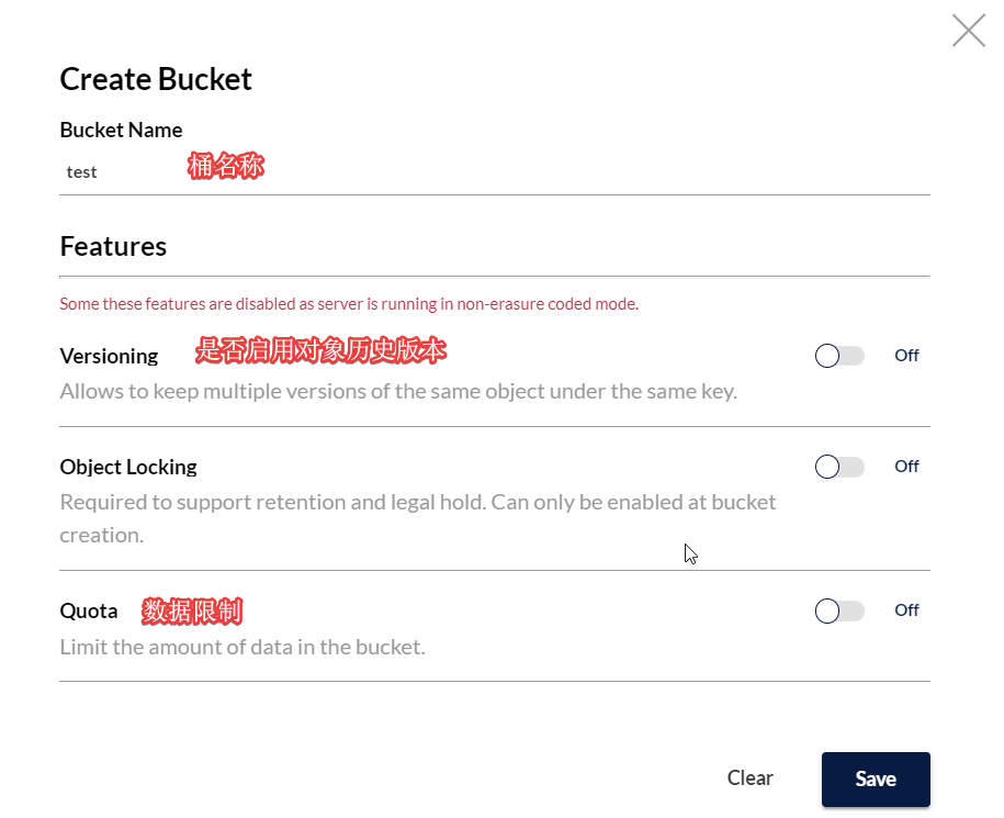 桶名称自己随便取一个,只要不重名就行。然后还可以选择是否启用对象(文件)历史版本,以及一些数据限制(比如容量或者文件数),不过上面是单磁盘运行的,似乎不支持这些特性。