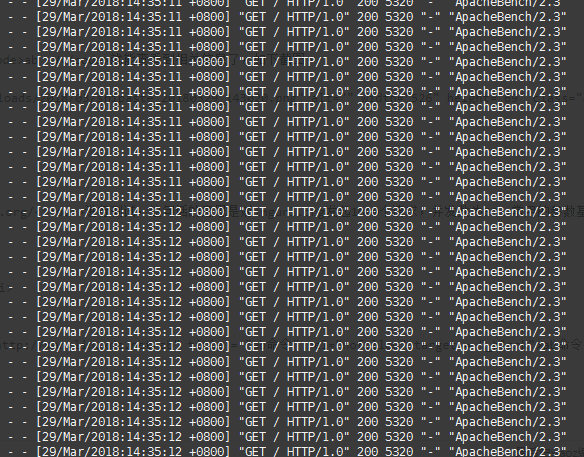 通过日志分析,发现刚刚 ab 命令发送了大量请求过来,如下截图,相当于网站正在遭受小规模的 CC 攻击。