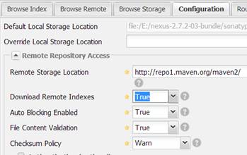 为了构建 Nexus 的 Maven 中央库索引,首先需要设置 Nexus 中 Maven Cencal 代理仓库下载远程索引,将“Download Remote Indexes”的值从默认值 false 改为 true。如图 7: