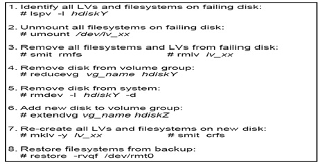 如果彻底的磁盘损坏,那么就需要利用备份设备(磁带机,磁带库等)将坏掉的磁盘的 lv,fs 信息全部删除,并且从系统中删除该磁盘的所有信息,最后添加新磁盘,并且按照原来的样子创建新的lv,fs,通过磁带进行恢复。