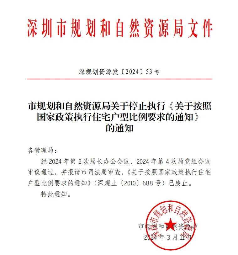 2024 年 3 月 26 日深圳市规划和自然资源局发布关于停止执行《关于按照国家政策执行住宅户型比例要求的通知的通知》,通知显示,深规土 [2010]668 号文《关于按照国家政策执行住宅户型比例要求的通知》已废止。