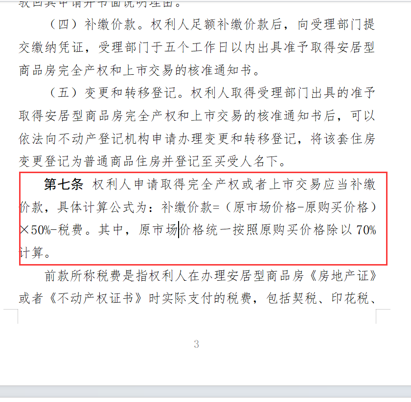 其中第七条:权利人申请取得完全产权或者上市交易应当补缴价款,具体计算公式为:补缴价款 =(原市场价格 - 原购买价格)×50%- 税费。其中,原市场价格统一按照原购买价格除以 70% 计算。