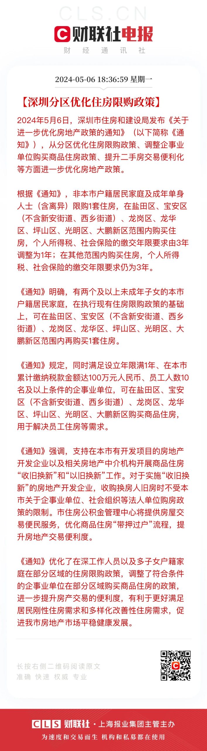 2024 年 5 月 6 日,深圳市住房和建设局发布《关于进一步优化房地产政策的通知》,从分区优化住房限购政策、调整企事业单位购买商品住房政策、提升二手房交易便利化等方面进一步优化房地产政策。